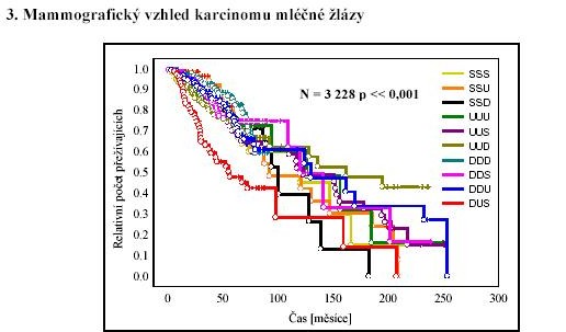 Neklasifikovatelný mammografický vzhled karcinomu mléčné žlázy (scirhoticko-ohraničeněneohraničený – označen jako DUS) se ve všech skupinách vyskytoval rovnoměrně.