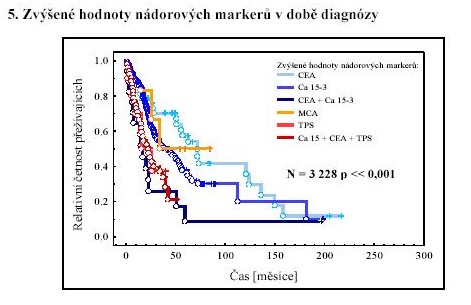 Signifikantně nekratší doba PFI, OS byla zaznamená při zvýšených hodnotách Ca 15 – 3 + CEA + TPS (v kombinaci) a při zvýšených hodnotách hladiny TPS a Ca 15-3 v době diagnózy.