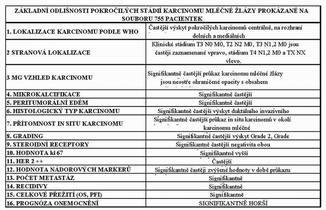 Jak bylo uvedeno, průkaz mikrokalcifikací ve skupině 755 pacientek s pokročilým karcinomem mléčné žlázy je statisticky signifikantně častější.