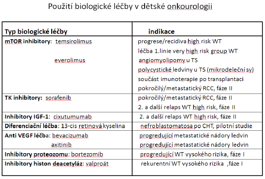 V souboru 104 pacientů s nádorem ledvin KDO FN Brno jsme použili biologickou léčbu pouze u 4 pacientů (1x thalidomid při 2. metastatickém relapsu u dívenky po HDCHT a APBSCT,1x retinoidy u pacientky s blastémovým podtypem bilaterálního Wilmsova nádoru vyrůstajícího na podkladě nefroblastomatosy, po nefrektomii pravé ledviny a centrálně uloženým reziduálním ložiskem. Everolimus byl indikován u 1 pacientky s bilaterálním angiomyolipomem ledvin jako součástí komplexu tuberosní sklerózy (indiklací je zvětšující se, progredující angiomyolipom, hematurie, klinické potíže) a u 1 pacientky s mikrodelečním syndromem (mutace TSC2/PDK1 genu) v rámci tuberosní sklerózy s polycystickou degenerací ledvin jako prevencí další progrese a oddálení ESRD (end stage renal disease) s nutností transplantace ledvin. Ze 4 pacientů žijí 3. Pacientka s 2. relapsem zemřela na progresi nemoci, dívenka s nefroblastomatosou je nyní v 2. CR, s dostačující funkcí solitární ledviny a nemusela absolvovat bilaterální nefrektomii s následnou transplantací ledvin, Dívka s angiomyolipomem dosáhla PR, dívka s mikrodelečním syndromem dosáhla stabilizace nálezu.