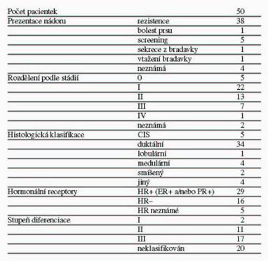 Základní charakteristiky souboru jsou shrnuty v tabulce 1. Na rozdíl od obvykle popisované distribuce exprese hormonálních receptorů v populaci premenopauzální žen (HR– : HR+, 50 % : 50 %) jsme pozorovali vyšší zastoupení žen s hormonálně dependentními nádory (64,4 %). Naopak trend k vyššímu gradingu byl ve shodě s literárními údaji.