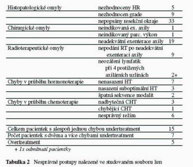 Z hlediska chemoterapie byl u třech pacientek pozorován overtreatment. U pacientky s DCIS bylo omylem podáno 6 cyklů adjuvantní CHT AC a u dvou pacientek s karcinomem prsu I. klinického stádia byla aplikována zbytečně intenzivní chemoterapie FEC100 6x, resp. FAC 6x. U několika dalších pacientek z jiných pracovišť byly nesprávně podány kombinace, které nemají v adjuvantní léčbě své místo (MMM, FEC50, CMF3, FTF), a lze tedy hovořit o podléčení pacientek. V jednom případě nebyla adj. chemoterapie u pacientky I. klinického stádia s tumorem GIII a negativními hormonálními receptory vůbec podána. Ve dvou případech byl aplikován Cardioxane, který by však u kurativních režimů neměl být nasazen z důvodu jeho možného protektivního efektu na nádorové buňky.