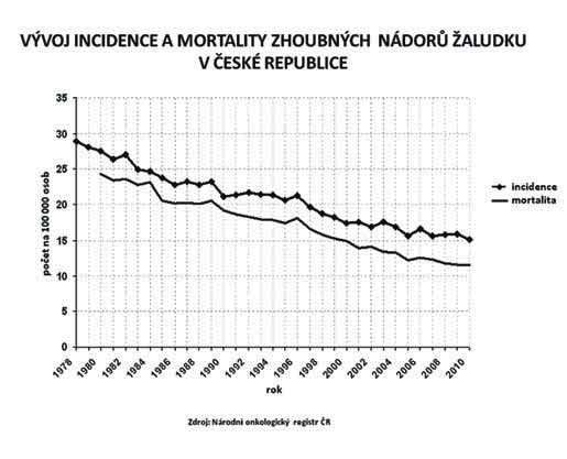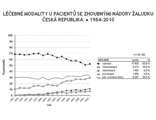 ZN žaludku v ČR tvoří v současnosti cca 4 % všech nádorových onemocnění a stejným procentem se podílejí na nádorové mortalitě. Hodnoty incidence i mortality vykazují v celém sledovaném období rovnoměrný a trvalý pokles u obou pohlaví (graf 1). Onemocnění bylo dia gnostikováno převážně v 6. a v 7. decenniu; průměrný věk u mužů 68 let, u žen 71 let, medián věku u mužů 69 let, u žen 74 let. Přes mírně se zvyšující podíl nižších klinických stadií bylo v celém sledovaném období až 40 % onemocnění dia gnostikováno ve IV. klinickém stadiu. Přehled léčebných modalit použitých u primárního onemocnění v období let 1994–2010 ukazuje klesající podíl operativy a postupný růst podílu chemoterapie, radioterapie i jiné (cílené) léčby (graf 2). V celosvětovém porovnání je incidence a mortalita ZN žaludku v ČR nižší, v porovnání s ostatními evropskými zeměmi jsou hodnoty v pásmu vyššího průměru.