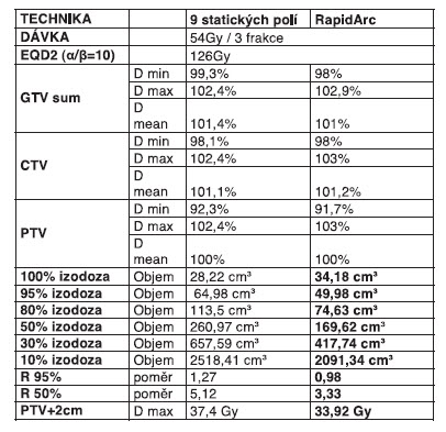 Při srovnání se standardní radioterapií odpovídají námi aplikované dávky přibližně 126 Gy, 96 Gy, resp. 80 Gy. Porovnání radiobiologické účinnosti pomocí LQ modelu je však při těchto dávkách pouze orientační. Dávku standardně předepisujeme na 100 % izodozu a hodnotíme pokrytí cílového objemu 95 % izodozou.