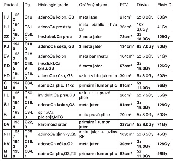 Do ledna 2011 jsme na klinice radiační onkologie MOU ozářili technikou SBRT celkem 15 pacientů. Jednalo se o 7 žen a 8 mužů, pět z nich bylo mladších 60ti let. Nejčastěji, tj. v osmi případech, jsme ozařovali oblast jater, ve třech případech plíce a dále po jednom pacientovi oblast plicního hilu, jaterního hilu, pankreatu, uzlin retroperitonea a metastáz v obratlech. Radikální dávku jsme aplikovali osmi pacientům.