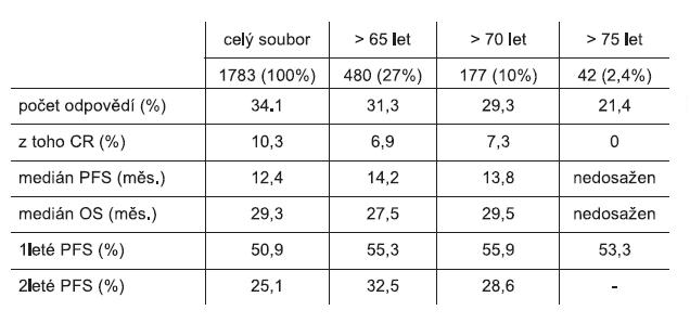 Cílem naší práce bylo zhodnocení efektu léčby bevacizumabem u pac. starších 65, 70 a 75 let vč. výskytu nežádoucích účinků, srovnat je výsledky dosaženými v celém souboru pacientů a poté je porovnat i s publikovanými výsledky analýz mezinárodních studií a registrů.
