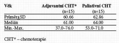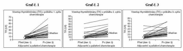Základní charakteristika souboru nemocných je uvedena v tabulce č.1. V následujících grafech jsou uvedeny jednotlivé hodnoty u všech 30 nemocných před a po jednotlivých cyklech. Z grafu č. 1–3 vyplývá, že ve většině případů byly hodnoty na začátku 1. cyklu nízké a výrazně stoupaly po skončení 1. cyklu chemoterapie. Do následujícího cyklu hodnoty opět klesly. Obdobnou dynamiku jsme zaznamenaly po druhém a třetím cyklu chemoterapie. Na základě těchto dynamických změn proto byly hodnoty thymidinkinázy korelovány s typem chemoterapie (adjuvantní, paliativní) a klinickým průběhem onemocnění. V následujících 3 grafech jsou jsou uvedeny příklady typických změn hodnot TK před a po adjuvantní chemoterapii (graf č.4 ) a paliativní chemoterapii (graf č. 5,6 ).