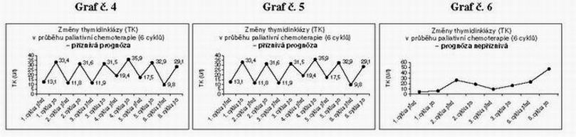 U adjuvantní chemoterapie byly hodnoty thymidinkinázy při zahájení každého cyklu terapie nízké a po skončení terapie vždy vysoké. (viz graf č. 4) U paliativní chemoterapie byla dynamika hodnot TK různá. Obecně lze konstatovat, že pokud se dynamika TK u paliativní chemoterapie podobala typické dynamice adjuvantní terapie, zaznamenali jsme u pacientů příznivou odpověď na léčbu. Pokud zůstávaly hodnoty trvale vysoké, či dokonce vzrůstaly, nebyla zaznamenána terapeutická odpověď. (viz graf č.5,6)