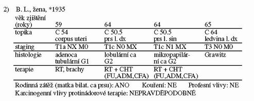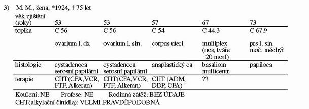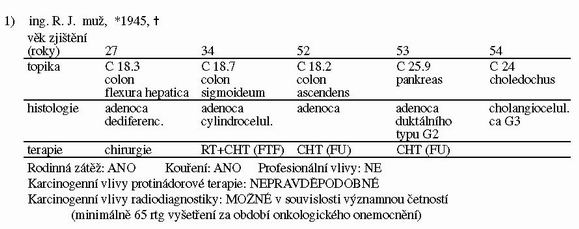Cílem našeho sdělení je poukázat na zvláštní případy mnohočetných (3 a vícečetných) malignit, které by perspektivně – za předpokladu dokonalejší genetické a molekulárně biologické diagnostiky – mohly přinést cenné zkušenosti v procesu onkogeneze, například v upřesnění dynamiky změn genetického materiálu onkologického pacienta.