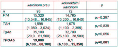 Mediány sérových koncentrací protilátek proti tyreoglobulinu byly sice vyšší u žen s karcinomem prsu oproti kolorektálnímu karcinomu (35,10 kIU.l-1 vs. 32,70 kIU.l-1, p=0,056), tento rozdíl byl však na hranici statistické významnosti (tabulka 2).