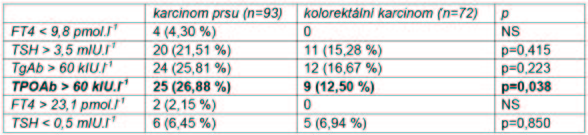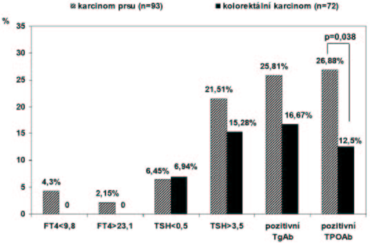Primárním cílem práce bylo formou průřezové studie porovnat procento pozitivity protilátek proti tyreoidální peroxidáze (TPOAb), tyreoglobulinu (TgAb) a procento patologických hodnot tyreoidálního stimulačního hormonu (TSH) a volného tyroxinu (FT4) v séru u žen s karcinomem prsu oproti kolorektálnímu karcinomu u takového množství pacientek, které umožní použít k statistickému hodnocení rozdílů četností χ2 test.