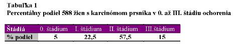 V retrospektívnom súbore sme zisťovali u 588 asymptomatických žien s karcinómom prsníka zvýšené markery CA 15-3, CEA a TPS. ženy s karcinómom prsníka boli najčastejšie v II. štádiu ochorenia v percentuálnom podiele podľa štádia ochorenia (tab. č.1)