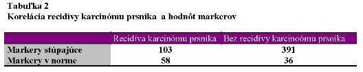 ženy s karcinómom prsníka po ročnom sledovaní s normálnymi hodnotami markerov sme zaradili do štúdie ako ženy bez recidívy ochorenia. V našom súbore ich bolo 391 žien. 36 žien malo stúpajúce markery bez dôkazu recidívy ochorenia. Zo 161 žien s recidívami karcinómu prsníka malo zvýšené markery 103 žien a 58 žien malo negatívne markery (tab. č.2)