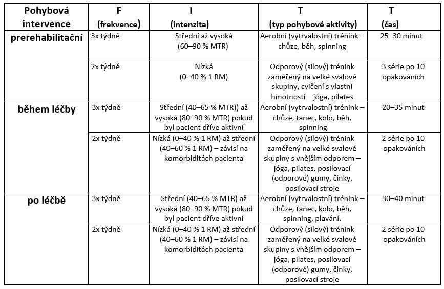 Jako nejefektivnější se jeví kombinace aerobního a odporového tréninku. Doporučovaný týdenní energetický výdej se pohybuje mezi 900 až 2000 Kcal. Vzhledem ke krátkodobému příznivému metabolickému efektu cvičení (48 hod), je pro oslabené osoby důležitá frekvence cvičení s maximální přestávkou 2 dny. Vzhledem k možným komplikacím v průběhu léčby (Axillary WEB syndrom, jizvy po operaci nebo radioterapii) je u řady pacientů výhodné zařadit protahování. Jinou komplikací může být chemoterapií navozená polyneuropatie, která je spojená s poruchami rovnováhy a vyšším rizikem pádu. Pro tyto případy je vhodné zařadit cvičení ke zlepšení rovnováhy a balance.