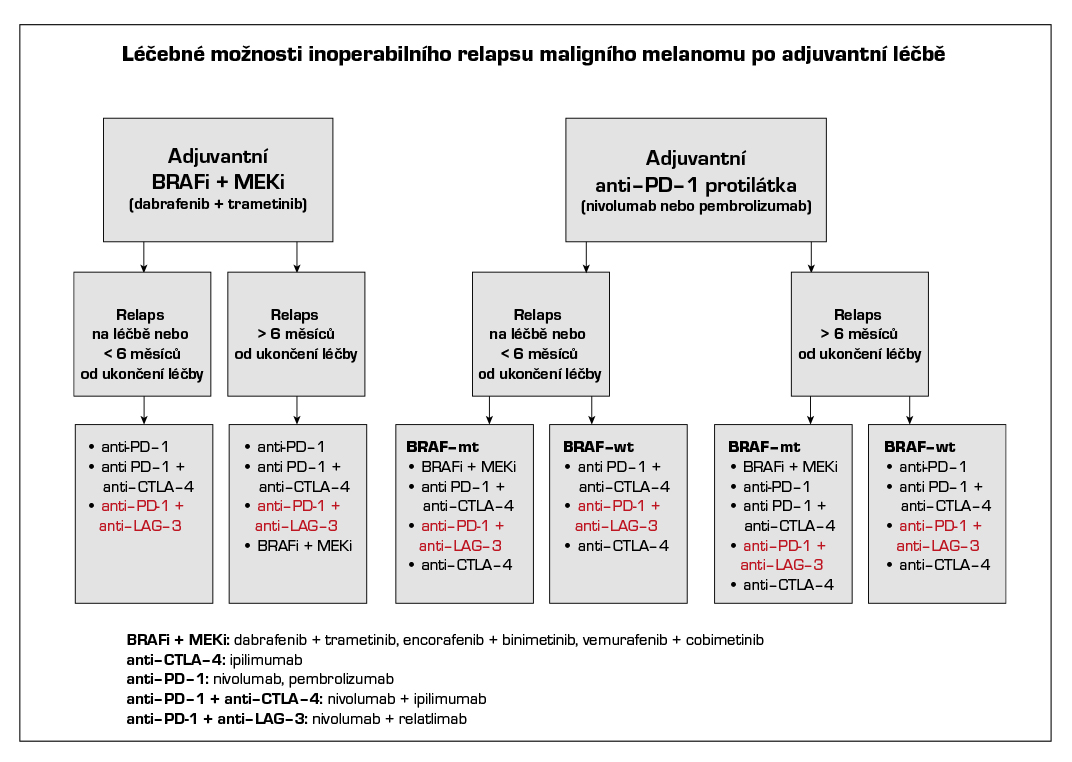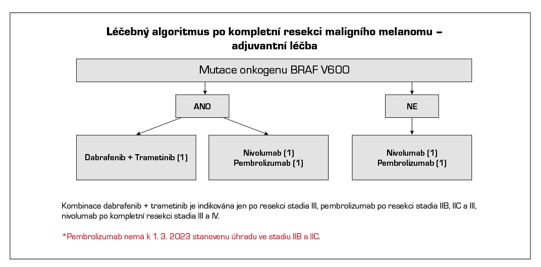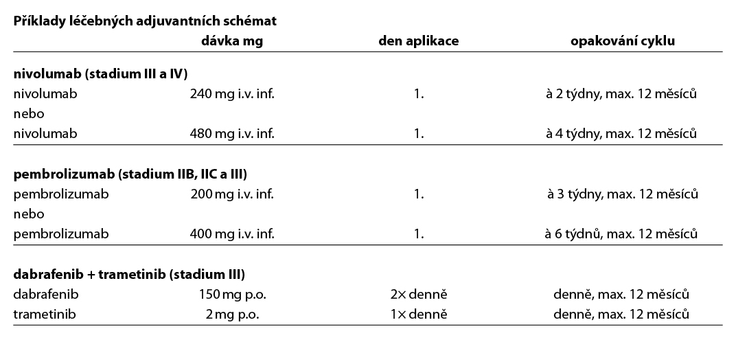 V adjuvantní léčbě maligního melanomu je standardem cílená léčba s kombinací BRAF a MEK inhibitoru a imunoterapie s checkpoint inhibitory. Z cílené léčby má aktuálně u pacientů s mutací onkogenu BRAF V600 registraci kombinace dabrafenib + trametinib (1). U moderní imunoterapie mají registraci v adjuvantní léčbě anti-PD-1 protilátky nivolumab (1) a pembrolizumab (1). Kombinace dabrafenib + trametinib je indikována k adjuvantní léčbě u pacientů po kompletní resekci u III. stadia, pembrolizumab po kompletní resekci u stadia IIB, IIC a III, nivolumab po kompletní resekci u stadia IIB, IIC, III a IV. Délka trvání adjuvantní léčby je maximálně 12 měsíců. U pacientů stadia IIIA dle AJCC-8, zvláště s velikostí mikrometastázy v sentinelové uzlině do 1 mm lze doporučit pouze dispenzarizaci. Riziko relapsu onemocnění je u této skupiny menší než u stadia IIB a IIC. Optimální léčba relapsu v případě selhání adjuvantní léčby je předmětem studií.