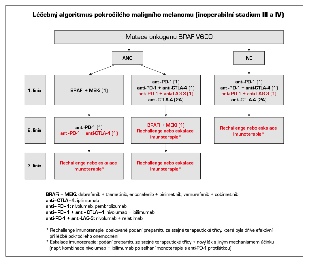 Volba optimální lékové sekvence závisí na komplexním zhodnocení všech relevantních faktorů – předchozí adjuvantní léčba, rozsah, agresivita a symptomy onemocnění, potenciální toxicita léčby, komorbidity, spolupráce a preference pacienta. Podle aktuálních ESMO doporučení by měla být v 1. linii u nepředléčených BRAF mutovaných melanomů preferována imunoterapie (optimálně kombinovaná imunoterapie, studie 3. fáze DREAMSEQ, studie 2. fáze SECOMBIT). Pokud není imunoterapie vhodná nebo není efektivní, tak je doporučena cílená léčba s BRAF a MEK inhibitory. U pacientů bez mutace onkogenu BRAF V600, lze na základě studií 2. fáze zvažovat v případě selhání monoterapie anti-PD-1 protilátkou (nivolumab, pembrolizumab) eskalaci imunoterapie na kombinaci nivolumab + ipilimumab (SWOG S1616 trial) či nivolumab + relatlimab (RELATIVITY-020).