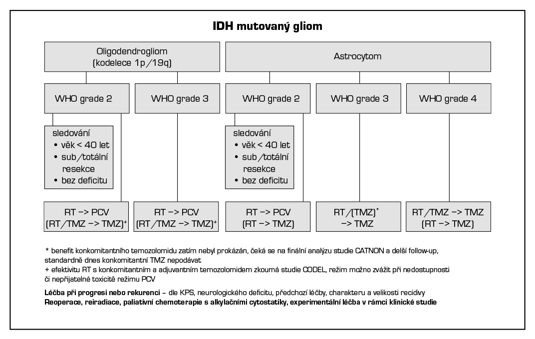 • konkomitantní chemoradioterapie + adjuvantní chemoterapie s temozolomidem (2A) u high-risk oligodendrogliomů