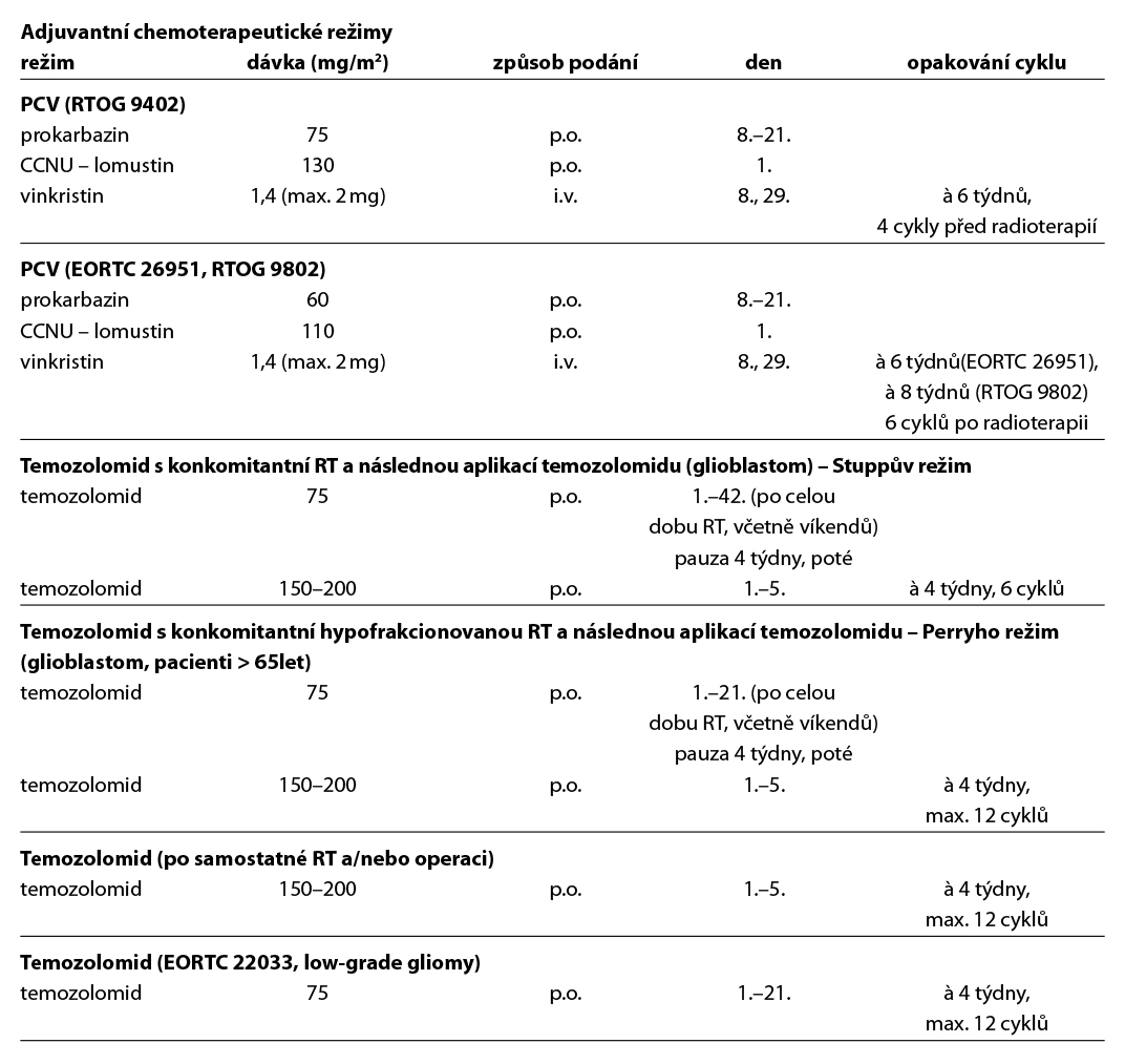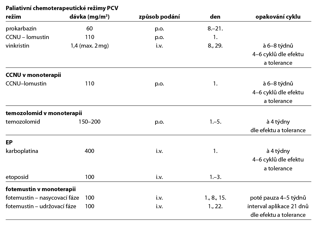 • preference režimů temozolomid monoterapie, lomustin monoterapie, PCV.
