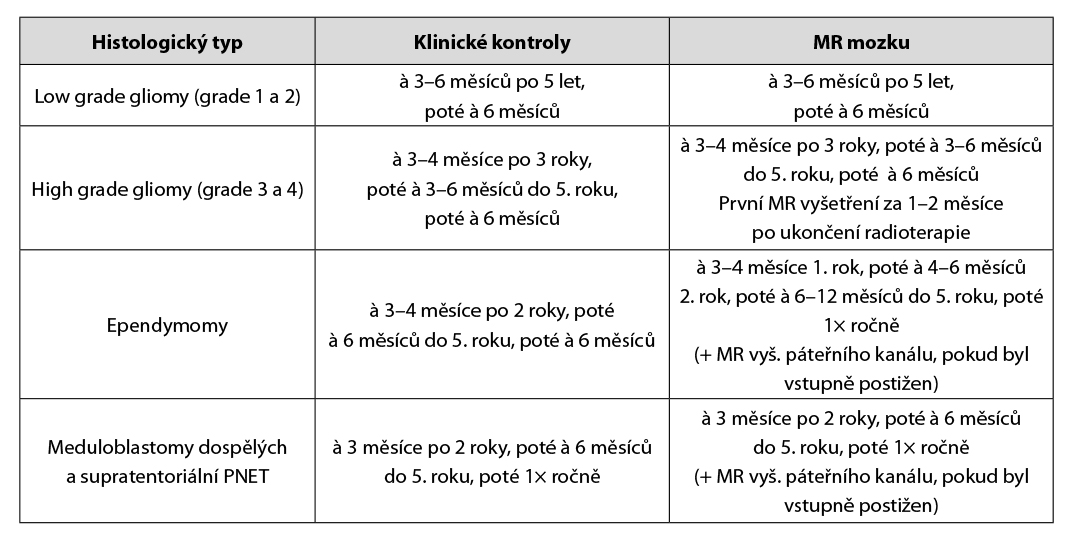 *Sledování jen u pacienta po sub/totální resekci, < 40 let, neurologicky stabilního nebo asymptomatického a u pacientů s WHO G1 difúzním gliomem pediatrického typu. Difúzní gliomy pediatrického typu jsou všechny IDH-wildtype a dělí se na low-grade a high-grade gliomy. Low-grade difúzní gliomy pediatrického typu mají lepší prognózu než IDH-mutované gliomy adultní.