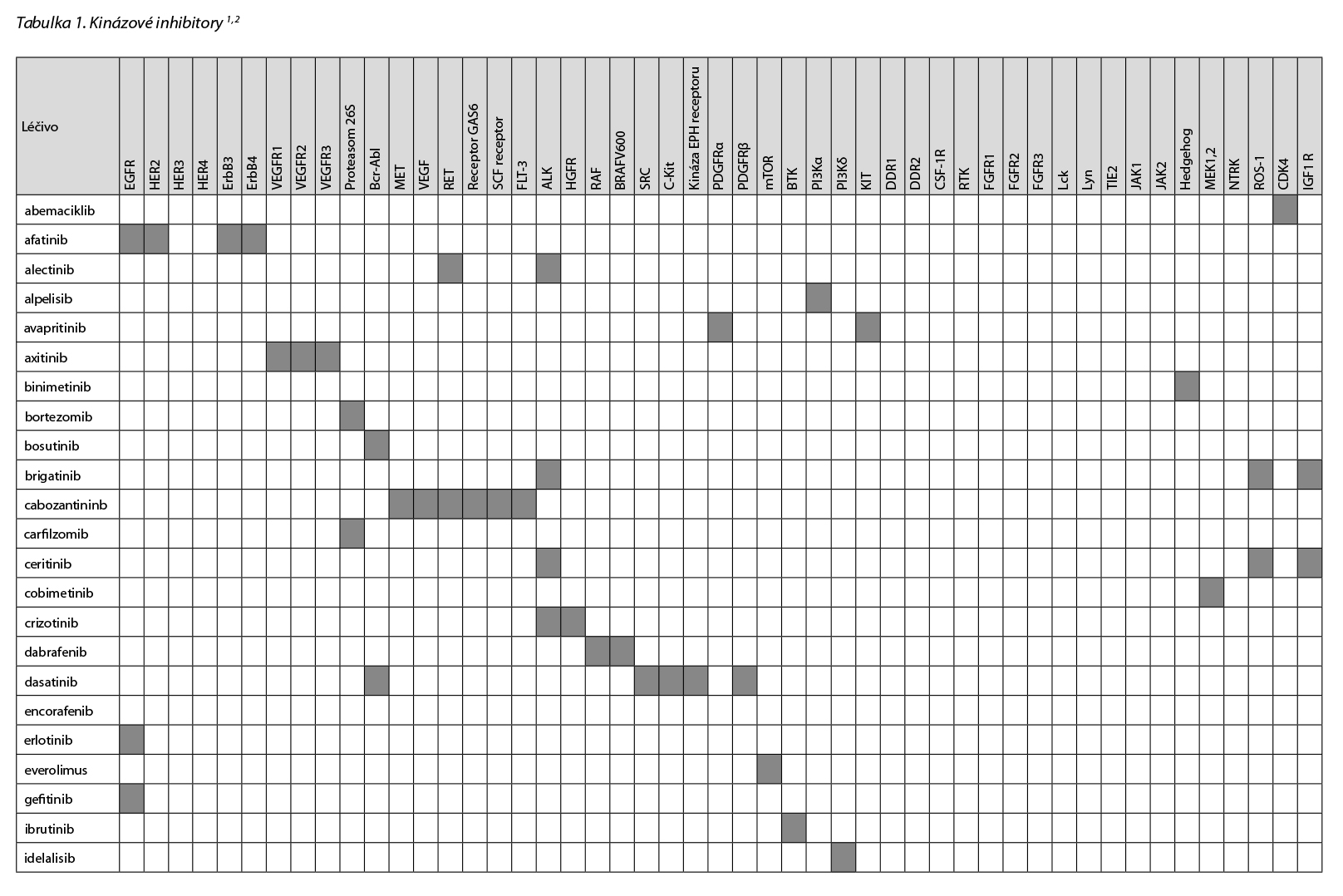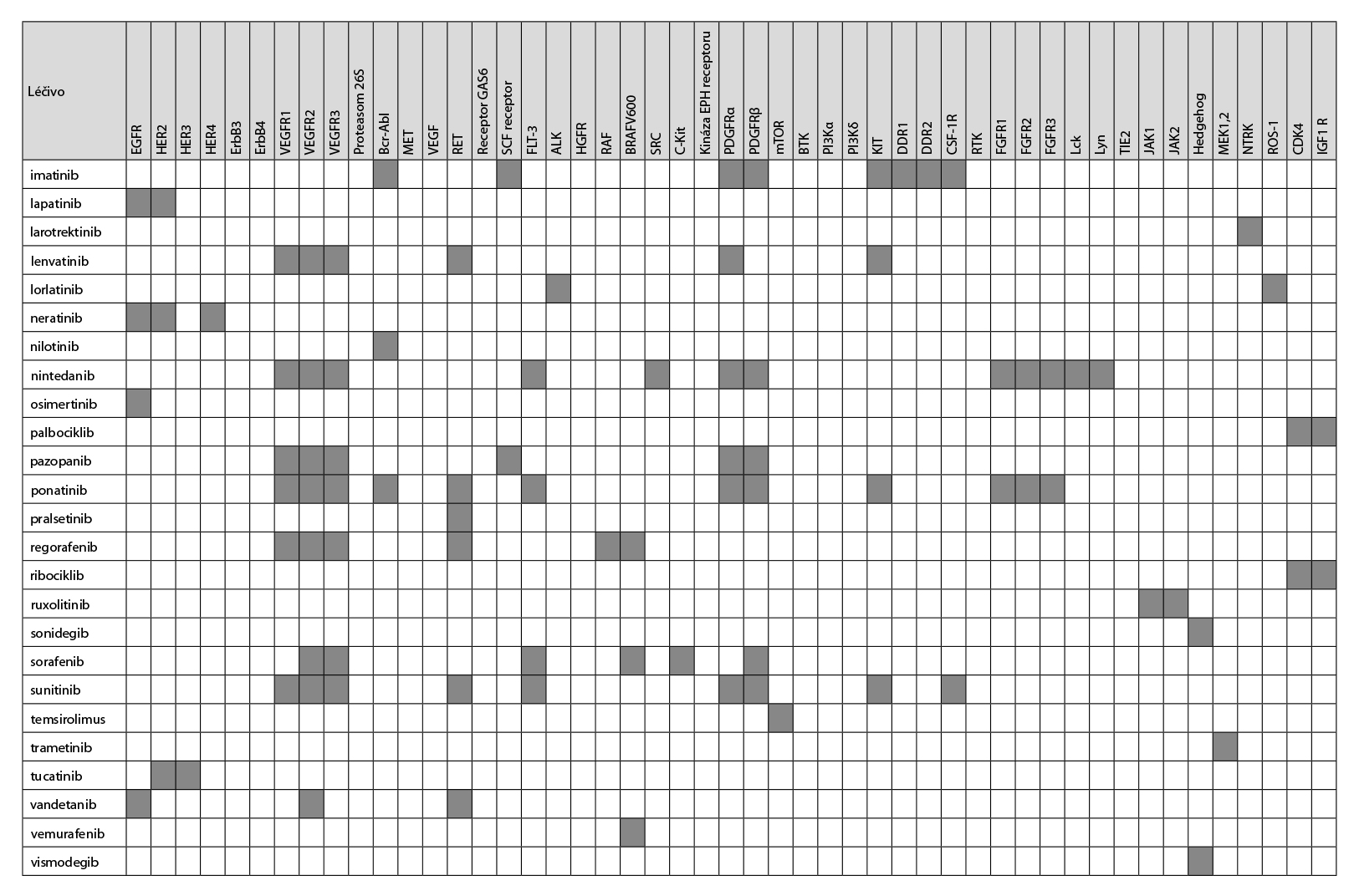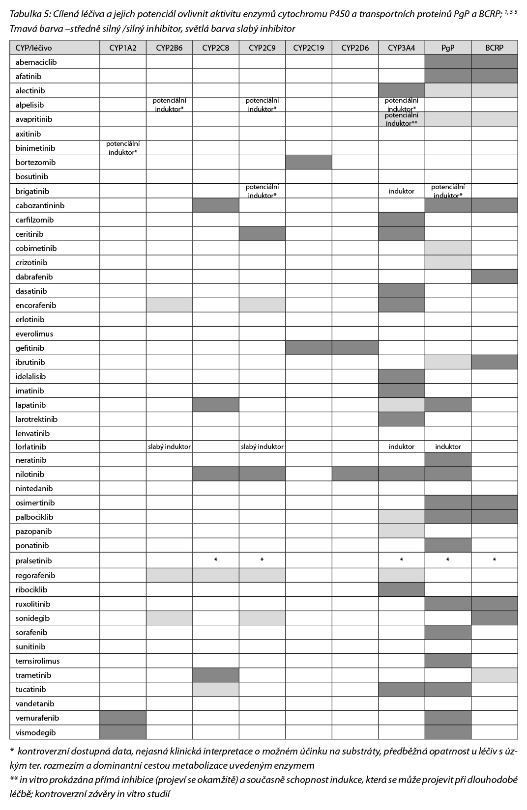 Kapitola se věnuje problematice farmakokinetických interakcí cílených léčiv, tzv. malých molekul, z nichž mnohé jsou metabolizovány dominantně jednou formou cytochromu P450 (CYP), popř. jsou inhibitory forem CYP. Z toho plyne nezanedbatelné riziko farmakokinetických interakcí, ať už směrem k metabolismu těchto léčiv, z nichž mnohá mají nepříliš široké terapeutické rozmezí anebo opačným směrem, kdy cílená léčba může zásadně změnit koncentrace souběžné medikace. Vedle cytochromu P450 často dochází k farmakokinetickým interakcím i na transportních proteinech jako jsou P-glykoprotein (P-gp, ABCB1), MRP1 (ABCC1), BCRP (ABCG2) nebo konjugačních enzymech, především na úrovni uridin glukuronyltransferázy (UGT). Interakce farmakodynamické, ke kterým také často dochází (např. sumace nebo potenciace orgánové toxicity, ovlivnění QT intervalu apod.), jsou příliš heterogenní na to, aby je bylo možno přehledně prezentovat; je tedy třeba je posuzovat a řešit individuálně, popř. ve spolupráci s klinickým farmaceutem/farmakologem. Přehled v Česku registrovaných léčiv skupiny tzv. cílené terapie malými molekulami a jejich cílových struktur uvádí následující tabulka.