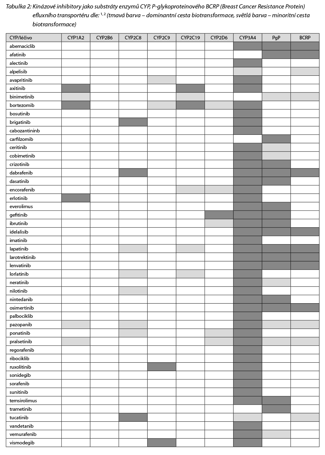 Nezanedbatelný je také potenciální vliv malých molekul na metabolismus jiných léčiv, protože mnohé kinázové inhibitory jsou klinicky významnými inhibitory biotransformačních enzymů a transportních proteinů, Tato inhibice pak může vyústit v toxicitu nebo četné nežádoucí účinky především u léčiv s úzkým terapeutickým oknem. Přehled léčiv (cílené léčby, malé molekuly) jako inhibitorů enzymů CYP a transportních proteinů BCRP a PgP uvádí Tabulka 6.