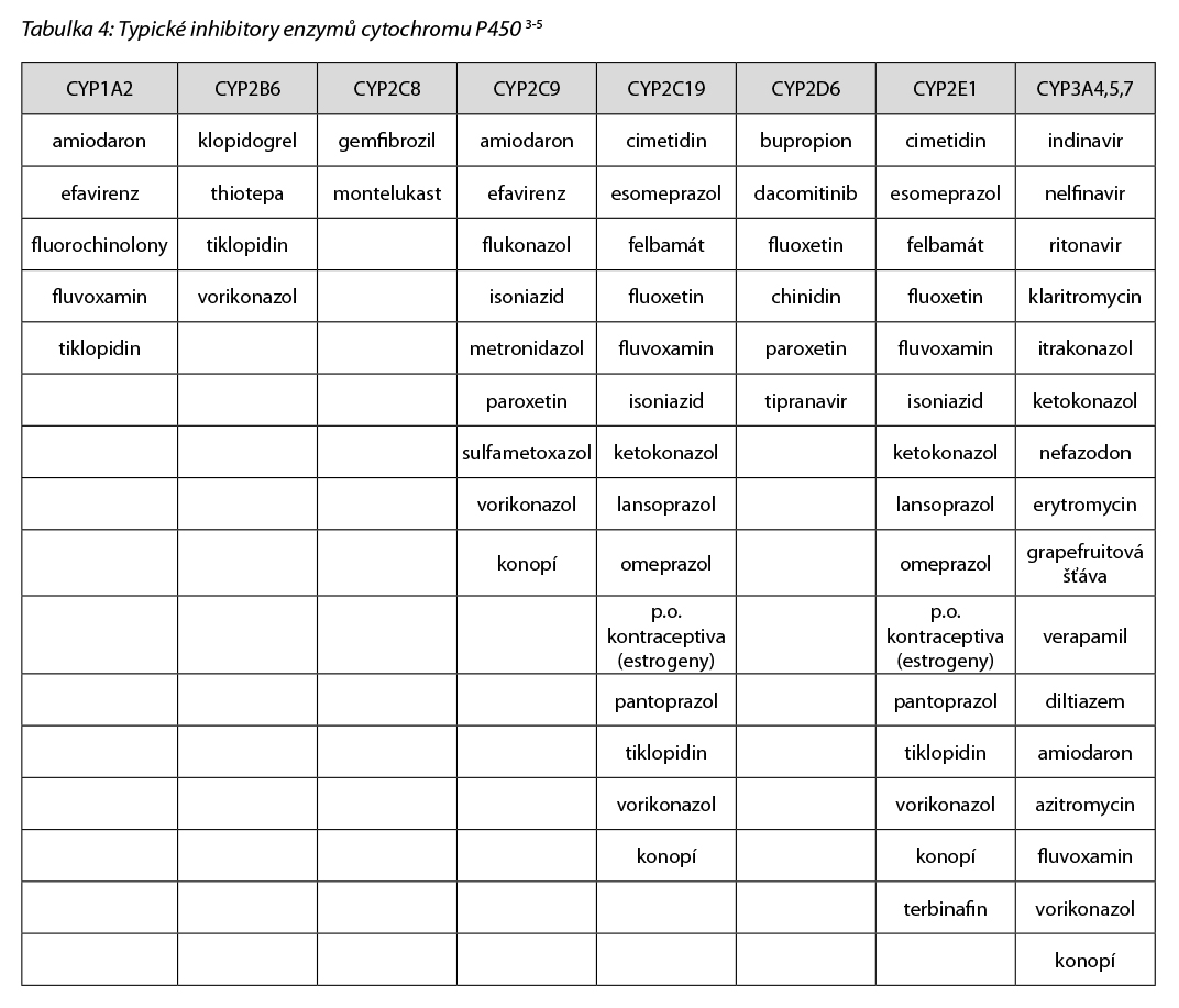 Nejčetnější jsou interakce na úrovni cytochromu P450 (CYP). Všechna léčiva mohou být substráty, induktory a inhibitory izoforem CYP. Jedno léčivo může být v určitých poměrech metabolizováno současně několika izoformami a pro každou z nich může být tato molekula nezávisle na sobě jako substrát, inhibitor nebo induktor (např. omeprazol je substrátem CYP2C19 a CYP3A4 a současně inhibitorem CYP2C19, diltiazem je substrátem CYP2C9 a zároveň inhibitorem CYP3A4 apod.). V tabulce 2 jsou uvedeny enzymy a transportéry, které metabolizují a transportují jednotlivé látky.