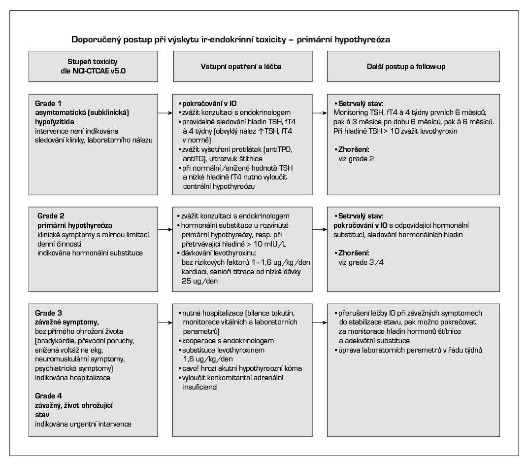 Ir – primární hypothyreóza je nejčastější endokrinopatií a vyskytuje se u 6–9 % pacientů léčených anti-PD1 a/nebo anti-PDL-1 terapií, u 4 % v případě anti-CTLA4 léčby a u ≤ 16 % v případě kombinované terapie anti-PD(L)-1 – anti-CTLA4 terapie. Většina případů se objeví do 3 měsíců od zahájení léčby.