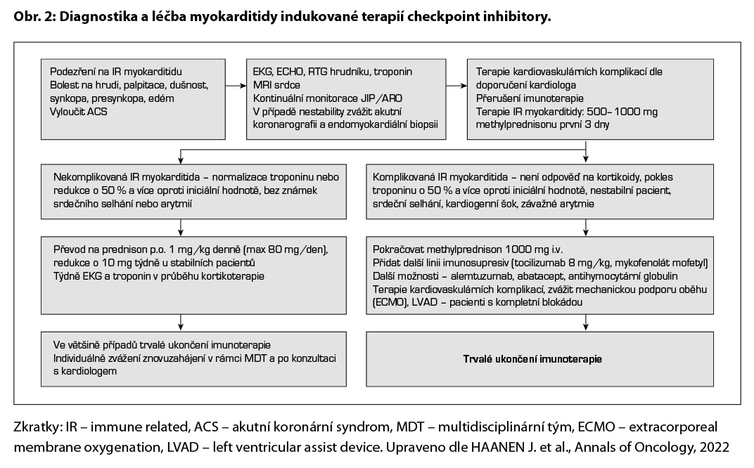 pokles EFLK, jiné imunitně podmíněné AE, MRI suspektní nález – pouze některé modifikovaná Lake Louise kritéria). Diagnostika a léčba myokarditidy indukované checkpoint inhibitory je zobrazena na Obr. 2.
