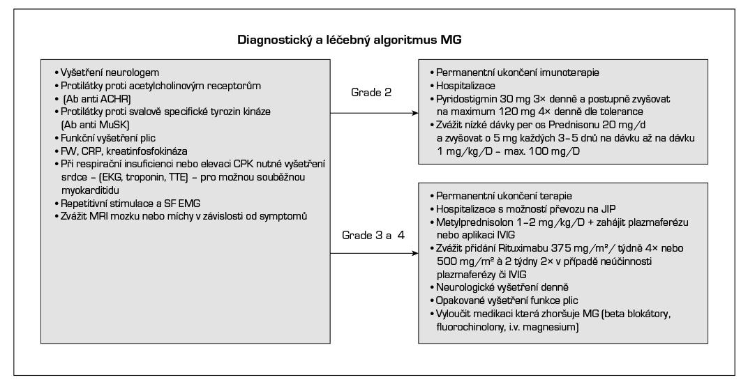 IR-MG je stále více uznávanou a obávanou komplikací související s imunoterapií. Typické příznaky zahrnují kolísající proximální svalovou slabost, která je závislá fyzické aktivitě, dále bulbární příznaky (dysfagie, dysartrie) a oční příznaky (asymetrická ptóza či diplopie).