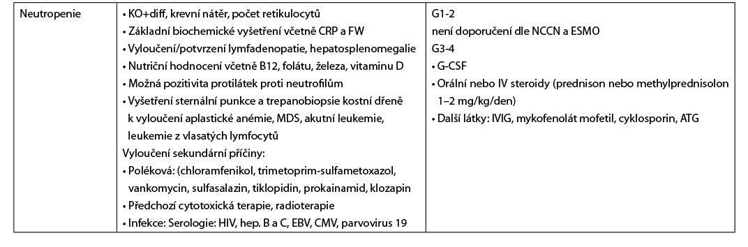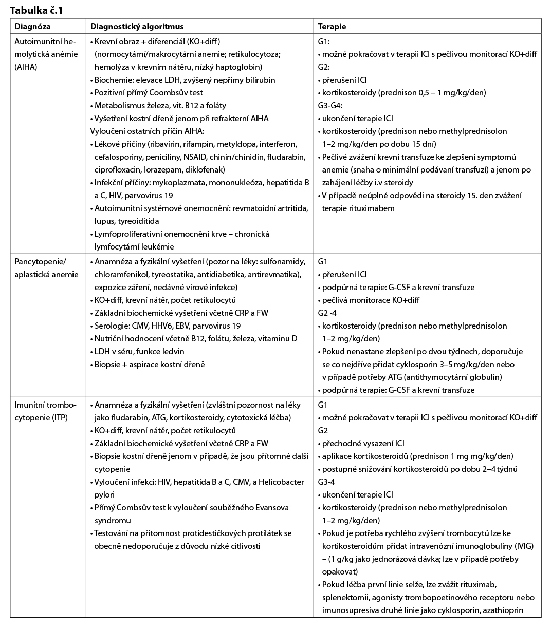 Závažná imunitně podmíněná (IR, immune related) hematologická toxicita je relativně vzácná (< 5 %), ale může být spojena s významnou mortalitou. Medián doby do nástupu IR-hematologické toxicity u kombinované imunoterapie je kratší než u monoterapie (12 oproti 25 týdnů). Doposud nejsou známe jasné predisponující rizikové faktory. U pacientů se základními hematologickými poruchami, jako je např. chronická lymfocytární leukémie léčených checkpoint inhibitory (ICI), byl pozorován vyšší výskyt hemolytické anémie. Diagnostický algoritmus a terapie klíčových IR – hematologických toxicit jsou shrnuté v tabulce č. 1. U závažných stupních toxicity (stupně ≥ 3) je nutná úzká spolupráce s hematologem.