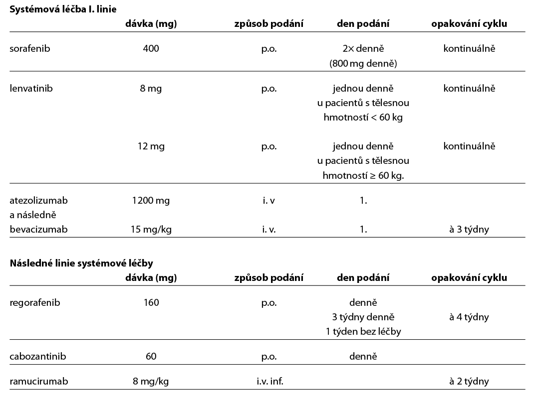 V první linii systémové léčby HCC lze podat sorafenib nebo lenvatinib nebo atezolizumab s bevacizumabem. V přímém srovnání kombinace atezolizumab/bevacizumab oproti sorafenibu vedla k prodloužení mediánu celkového přežití o 6 měsíců, tj. 19,2 verzus 13,4 měsíce. Další možností léčby kromě TKI, zvláště pro pacienty s jícnovými varixy, je kombinace tremelimumab/durvalumab nebo durvalumab monoterapie. O úhradu je však nutné žádat. Nejsou data podporující podávání kombinované léčby tj. pooperační podání TKI či kombinaci nebo sekvenční podání TACE a TKI nebo jiné systémové léčby . Při progresi na lokálně ablativních metodách nebo pokud nejsou technicky vhodné lze zahájit léčbu systémovou i ve stadiu B. Při progresi na sorafenibu lze dobře vybraným pacientům v dobrém výkonnostním stavu (PS≤1) podat regorafenib nebo cabozantinib nebo ramucirumab (ramucirumab jen při AFP ≥400 ng/ml). Podmínkou je předpoklad dobré spolupráce. Systémová chemoterapie v adjuvantní indikaci a v indikaci paliativní nezlepšuje výsledky přežití.