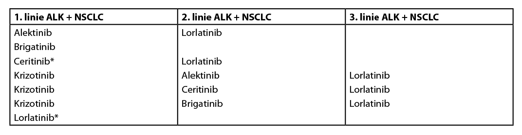 • Ceritinib* v monoterapii je indikován v první linii léčby u dospělých pacientů s pokročilým NSCLC pozitivním na kinázu anaplastického lymfomu (ALK).