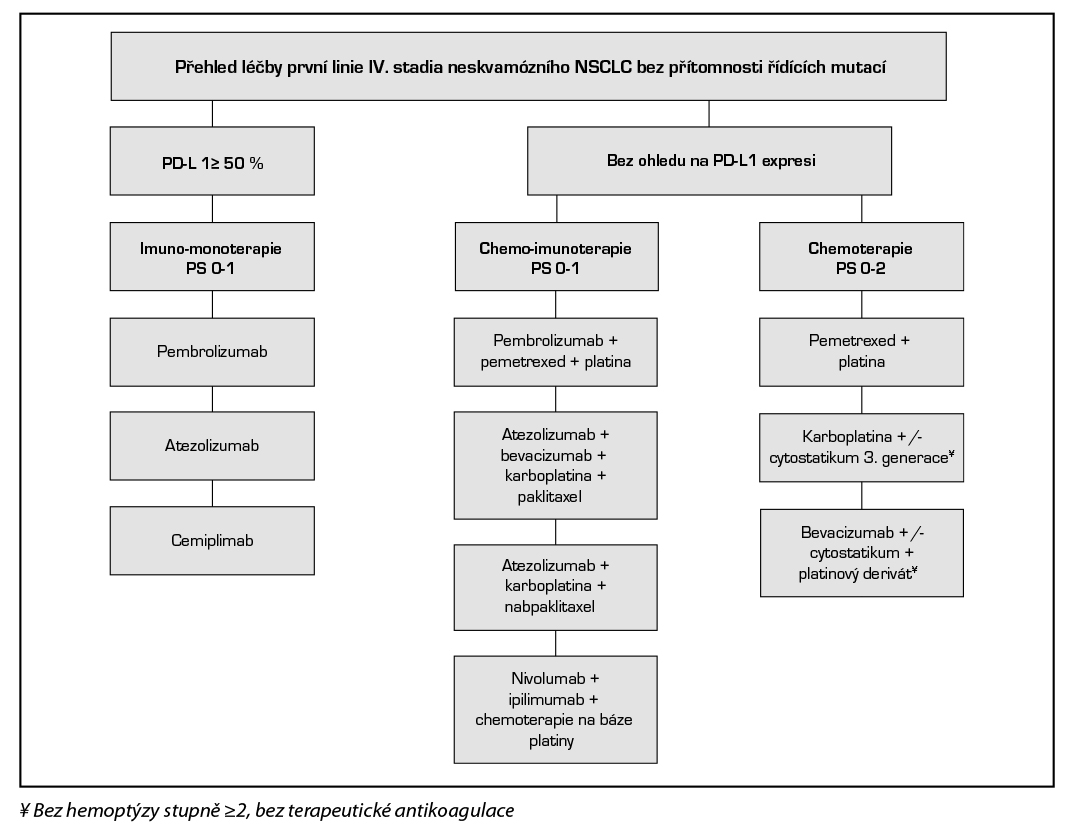 U nemocných s neskvamózním NSCLC bez aktivační mutace je pak dalším rozhodovacím kritériem nepřítomnost kontraindikace podávání bevacizumabu, který je možno podat s chemoterapeutickým režimem založeným na platinovém derivátu (pro kombinaci s bevacizumabem nejsou vhodné režimy s vysokým rizikem trombocytopenie).