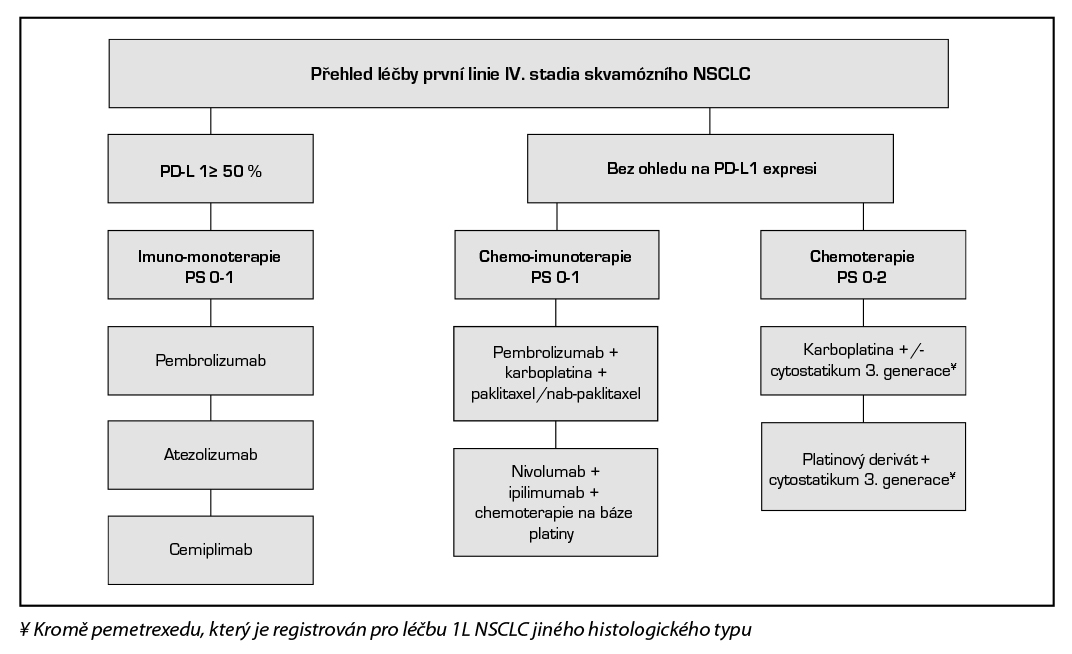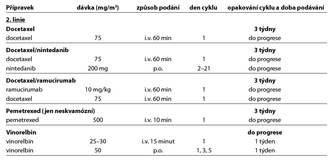 Standardem léčby pacientů (mužů a žen) starších 18 let se skvamózním i neskvamózním nemalobuněčným karcinomem plic progredujícím po předchozí systémové terapii na bázi platiny je terapie checkpoint inhibitory, pokud nebyly podány v první linii. U pacientů bez ohledu na výši exprese PD-L1 je indikován nivolumab nebo atezolizumab v monoterapii. U pacientů s expresi PD-L1 ≥1 % pembrolizumab* v monoterapii. U vhodně indikovaných nemocných je prokázáno prodloužení celkového přežití další linií systémové terapie. Doporučena je monoterapie. Srovnatelnou účinnost prokázal v této indikaci docetaxel (u všech histologických typů) a pemetrexed (pouze u pacientů s nedlaždicobuněčnou histologii), pokud nebyly podány v první linii. Další léčebnou alternativou ve druhé nebo třetí linii je erlotinib, a to především u pacientů nevhodných na imunoterapii nebo s EGFR neznámým/wild typem statusem. Docetaxel a erlotinib jsou vhodné u všech histologických podskupin nemocných. Pokud je zvažován docetaxel u adenokarcinomu, je indikováno podání společně s nintedanibem*, což je perorální inhibitor angiogeneze, působící na receptory pro vaskulární endoteliální faktor (VEGFR 1-3), receptory pro růstový faktor odvozený od trombocytů (PDGFR-alfa a beta) a receptory pro fibroblastový růstový faktor (FGFR-1-3). Dále je v kombinaci s docetaxelem indikován ramucirumab* k léčbě dospělých pacientů s lokálně pokročilým nebo metastazujícím nemalobuněčným karcinomem plic, u kterých po chemoterapii založené na platině došlo k progresi onemocnění.