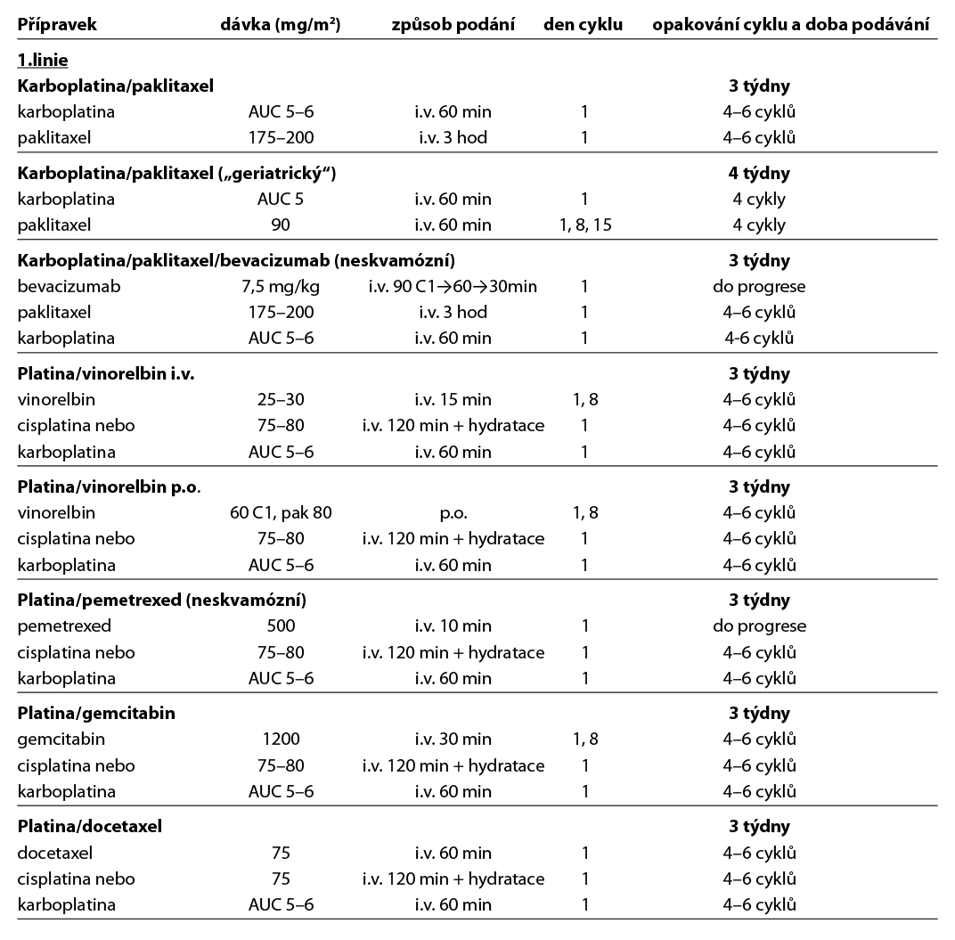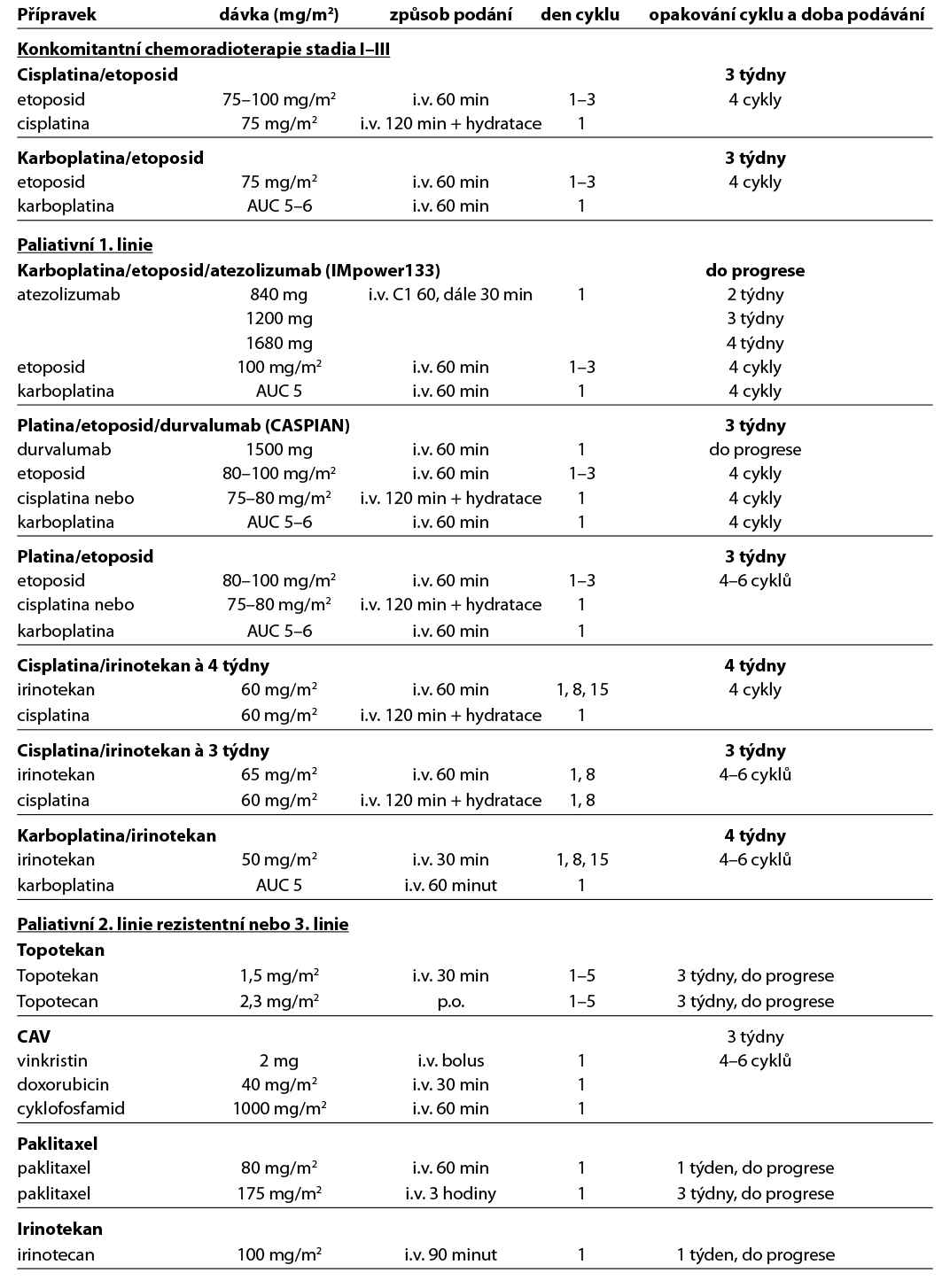 Jsou indikovány přípravky s prokázanou účinností u malobuněčného karcinomu plic. Počet cyklů je zpravidla 4–6. Příklady doporučených kombinací viz tabulka 8.6.6.