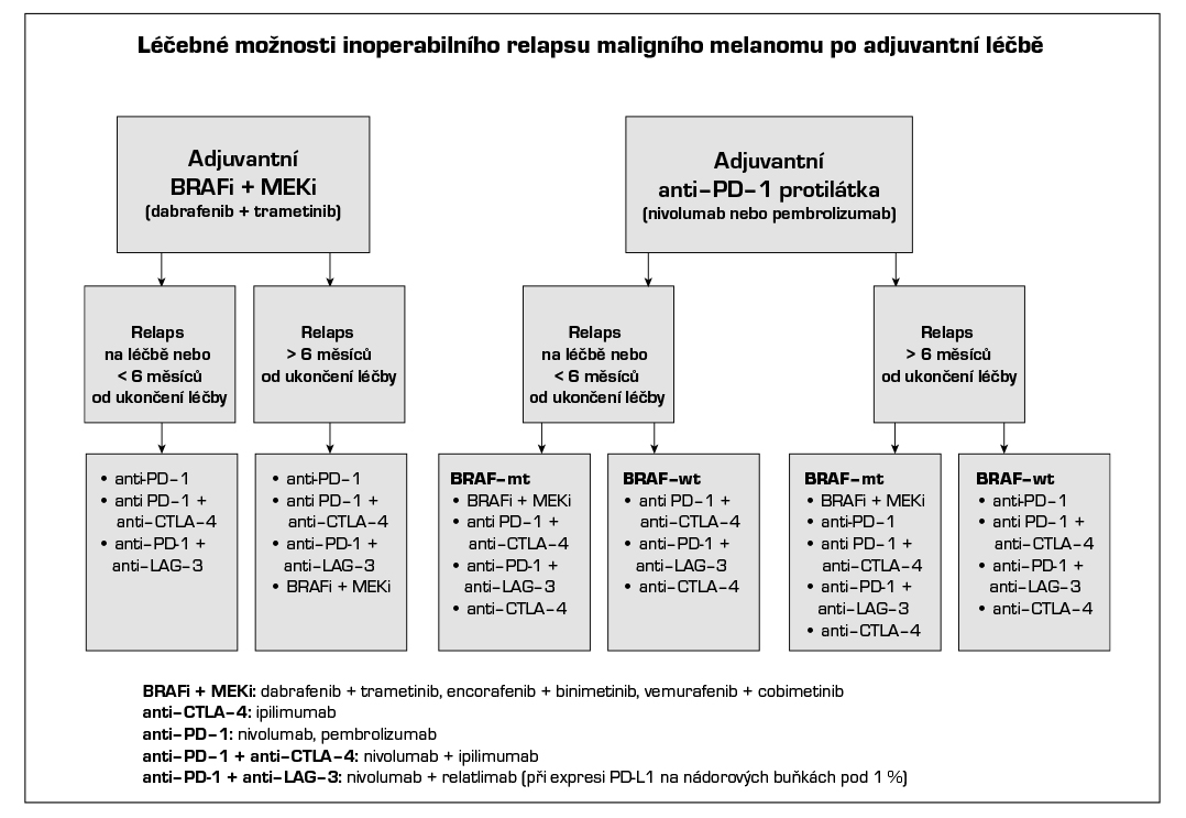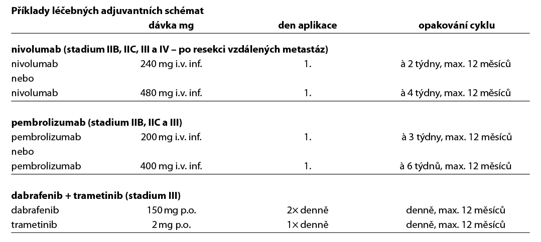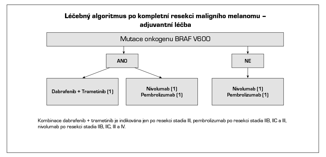 V adjuvantní léčbě maligního melanomu je standardem cílená léčba s kombinací BRAF a MEK inhibitoru a imunoterapie s checkpoint inhibitory. Z cílené léčby má aktuálně u pacientů s mutací onkogenu BRAF V600 registraci kombinace dabrafenib + trametinib (1). U moderní imunoterapie mají registraci v adjuvantní léčbě anti-PD-1 protilátky nivolumab (1) a pembrolizumab (1). Kombinace dabrafenib + trametinib je indikována k adjuvantní léčbě u pacientů po kompletní resekci u III. stadia, pembrolizumab po kompletní resekci u stadia IIB, IIC a III, nivolumab po kompletní resekci u stadia IIB, IIC, III a IV. Délka trvání adjuvantní léčby je maximálně 12 měsíců. U pacientů stadia IIIA dle AJCC-8, zvláště s velikostí mikrometastázy v sentinelové uzlině do 1 mm lze doporučit pouze dispenzarizaci. Riziko relapsu onemocnění je u této skupiny menší než u stadia IIB a IIC. Optimální léčba relapsu v případě selhání adjuvantní léčby je předmětem studií.