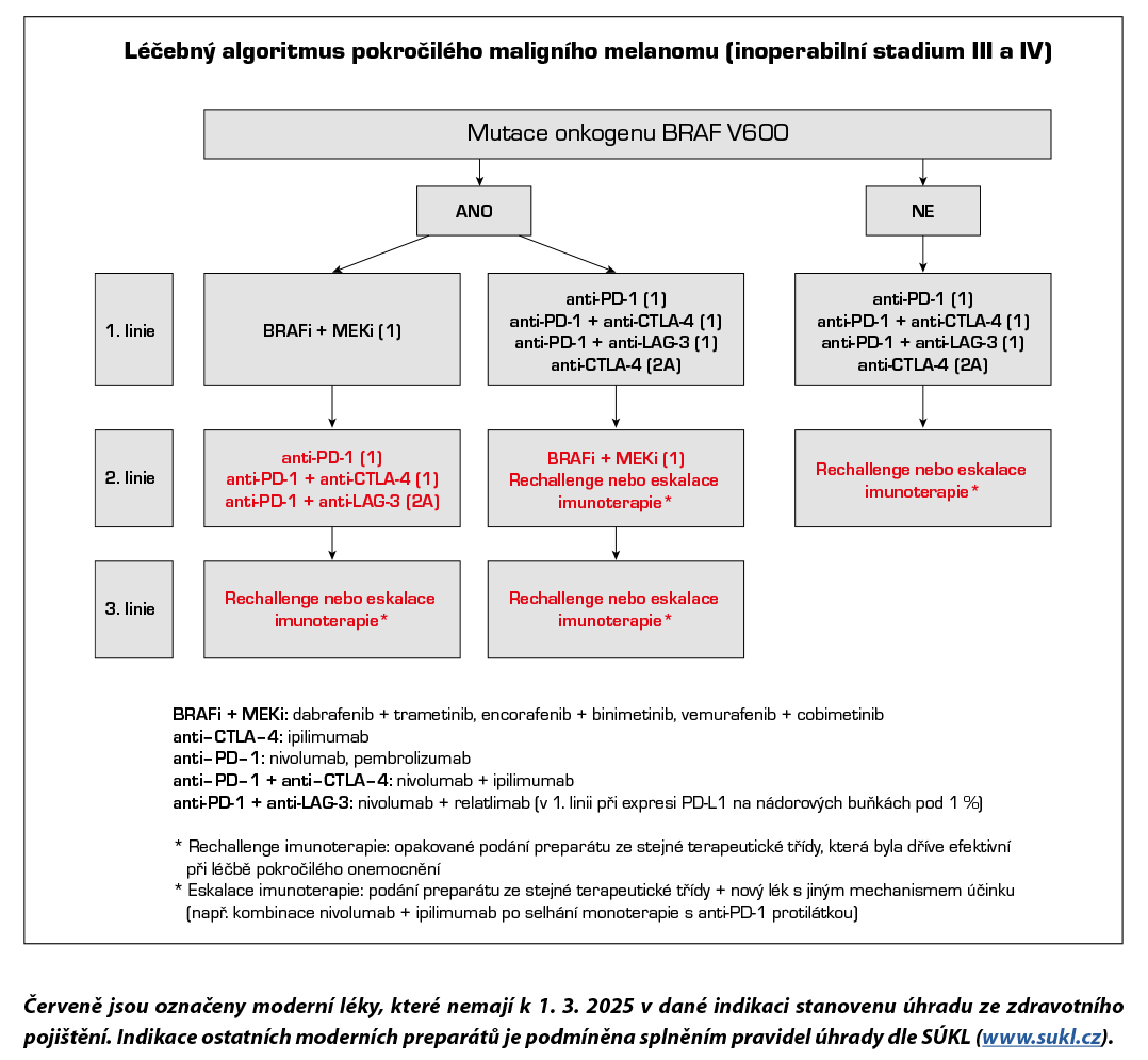 Volba optimální lékové sekvence závisí na komplexním zhodnocení všech relevantních faktorů – předchozí adjuvantní léčba, rozsah, agresivita a symptomy onemocnění, potenciální toxicita léčby, komorbidity, spolupráce a preference pacienta. Podle aktuálních ESMO doporučení by měla být v 1. linii u nepředléčených BRAF mutovaných melanomů preferována imunoterapie (optimálně kombinovaná imunoterapie, studie 3. fáze DREAMSEQ, studie 2. fáze SECOMBIT). Pokud není imunoterapie vhodná nebo není efektivní, tak je doporučena cílená léčba s BRAF a MEK inhibitory. U pacientů bez mutace onkogenu BRAF V600, lze na základě studií 2. fáze zvažovat v případě selhání monoterapie anti-PD-1 protilátkou (nivolumab, pembrolizumab) eskalaci imunoterapie na kombinaci nivolumab + ipilimumab (SWOG S1616 trial) či nivolumab + relatlimab (RELATIVITY-020).