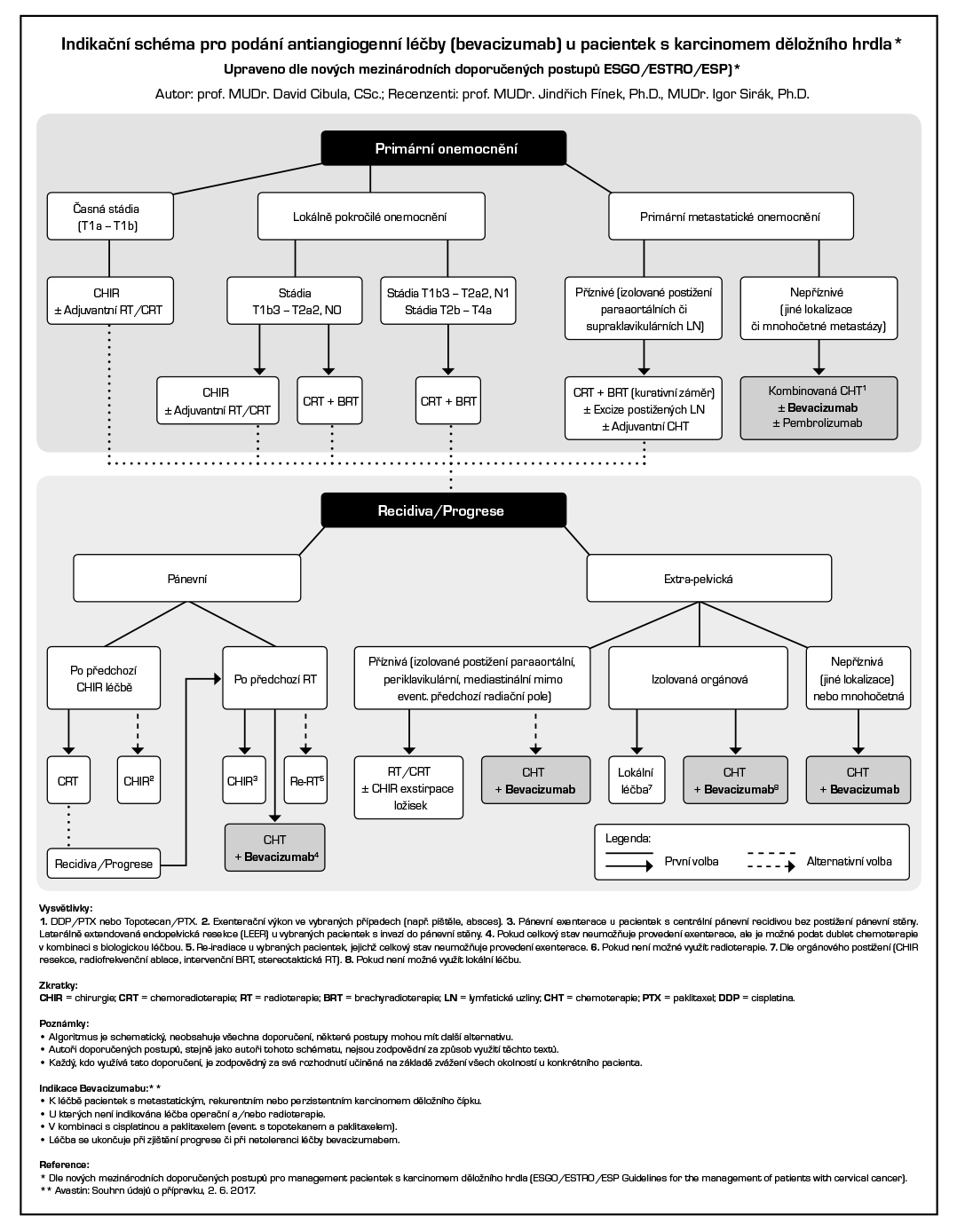 U pacientek s karcinomem děložního hrdla stádia I-IVB by před zahájením jakékoliv léčby včetně operačního výkonu měl být léčebný postup konzultován v rámci multidisciplinárního týmu (MDT). Pacientka by měla být znovu konzultována cestou MTD po provedení operace. U nemocných s de novo metastatickým onemocněním (stádium IV v době diagnózy) je primárně preferovaná systémová léčba. Oligometastatické onemocnění (1, maximálně 2 MTS léze) má být léčeno multimodálně. Konkrétní léčebný postup u pacientek s oligometastatickým onemocněním je vhodné konzultovat v rámci MDT. V případě 3 a více metastatických ložisek má být onemocnění léčeno podle standardů pro pokročilé onemocnění, se zařazením lokální léčby dle symptomů.