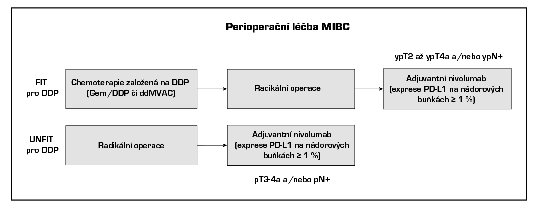 Adjuvantní systémová chemoterapie je zvažována po cystektomii u lokálně pokročilých nádorů (pT3, pT4) a při průkazu lymfovaskulární invaze u pacientů, kteří nedostali neoadjuvantní chemoterapii a jsou cisplatina fit (definice níže) (úroveň důkazů 2B). Také je možné podání adjuvantní léčby nivolumabem a to v situacích uvedených v schématu níže, při pozitivitě exprese PD-L1 na nádorových buňkách ≥ 1% (úroveň důkazů 1).