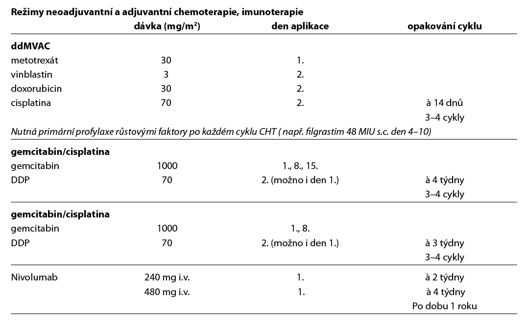 Neoadjuvantní systémová chemoterapie s cisplatinou v případě T2-T4a N0M0 tumorů se podává před cystektomií s cílem eradikace potenciálních mikrometastáz, respektive dosažení downstagingu (úroveň důkazů 1). Pouze s cisplatinou kombinované neoadjuvantní režimy prokázaly prodloužení přežití. V současnosti je neoadjuvantní systémová chemoterapie preferována před adjuvantní. U pacientů s hraniční či mírnou renální insuficiencí je možno rozdělit dávku cisplatiny na dva dny (35 mg/m2 – den 1 a 2, či den 1 a 8; úroveň důkazů 2B). Perioperativní chemoterapie s karboplatinou není v této indikaci doporučena. MVAC v klasickém dávkování není v neoadjuvanci doporučen pro vyšší toxicitu ve srovnání s režimy ddMVAC a gemcitabin/DDP.
