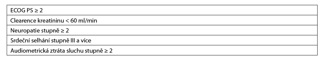 V níže uvedené tabulce jsou uvedeny kontraindikace k podání cisplatiny (cisplatina„unfit“ pacienti) – stačí splnění jedno ho parametru. U poruchy sluchu je indikace k podání cisplatiny na zvážení klinického onkologa. Kromě níže uvedených se uplatňují obecné kontraindikace chemoterapie (ECOG ≥ 3, závažné komorbidity zásadně ovlivňující přežití nebo orgánové funkce, dále aktivní závažná infekce, nesouhlas a nespolupráce pacienta).