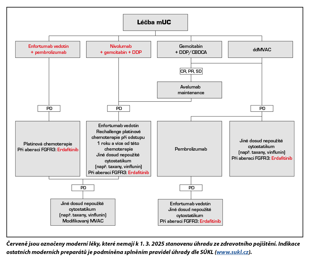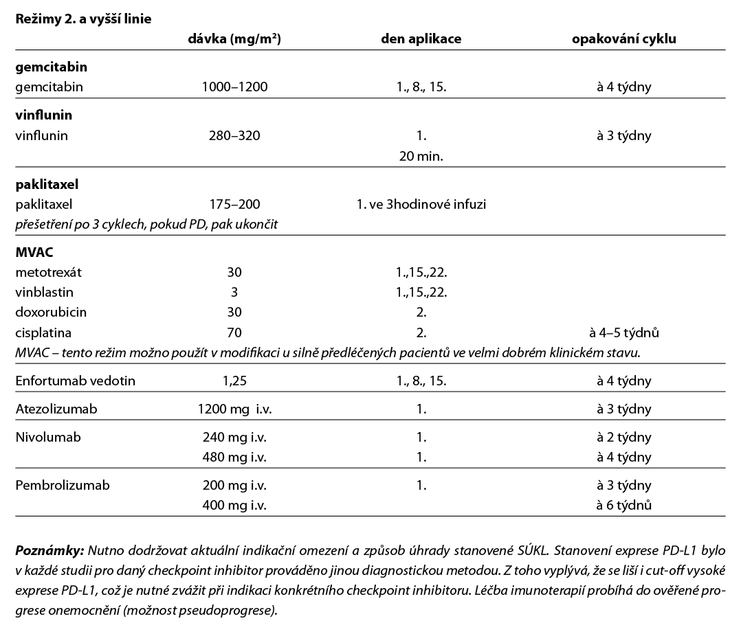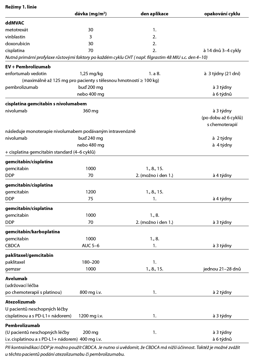 Níže uvedené schéma poskytuji doporučení k léčbě (mUC), za indikaci léčby je plně odpovědný klinický onkolog, je nutné přihlédnout k aktuálním podmínkám úhrady (sukl.cz), celkovém stavu pacienta a jeho onemocnění a cílům léčby. V současnosti není dostatek důkazů pro rozdílnou léčbu metastatického uroteliálního karcinomu podle lokalizace primárního nádoru (močový měchýř, uretra, močovody, ledvinné pánvičky).