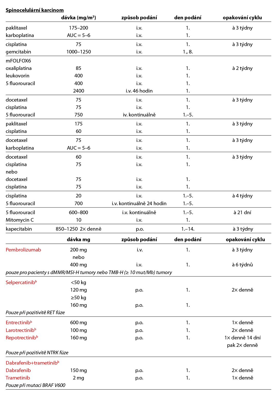 Léčba jednotlivých klinických variant postižení adenokarcinomem, spinocelulárním karcinomem a neuroendokrinním nádorem neznámého origa je uvedena v následujícím přehledu.