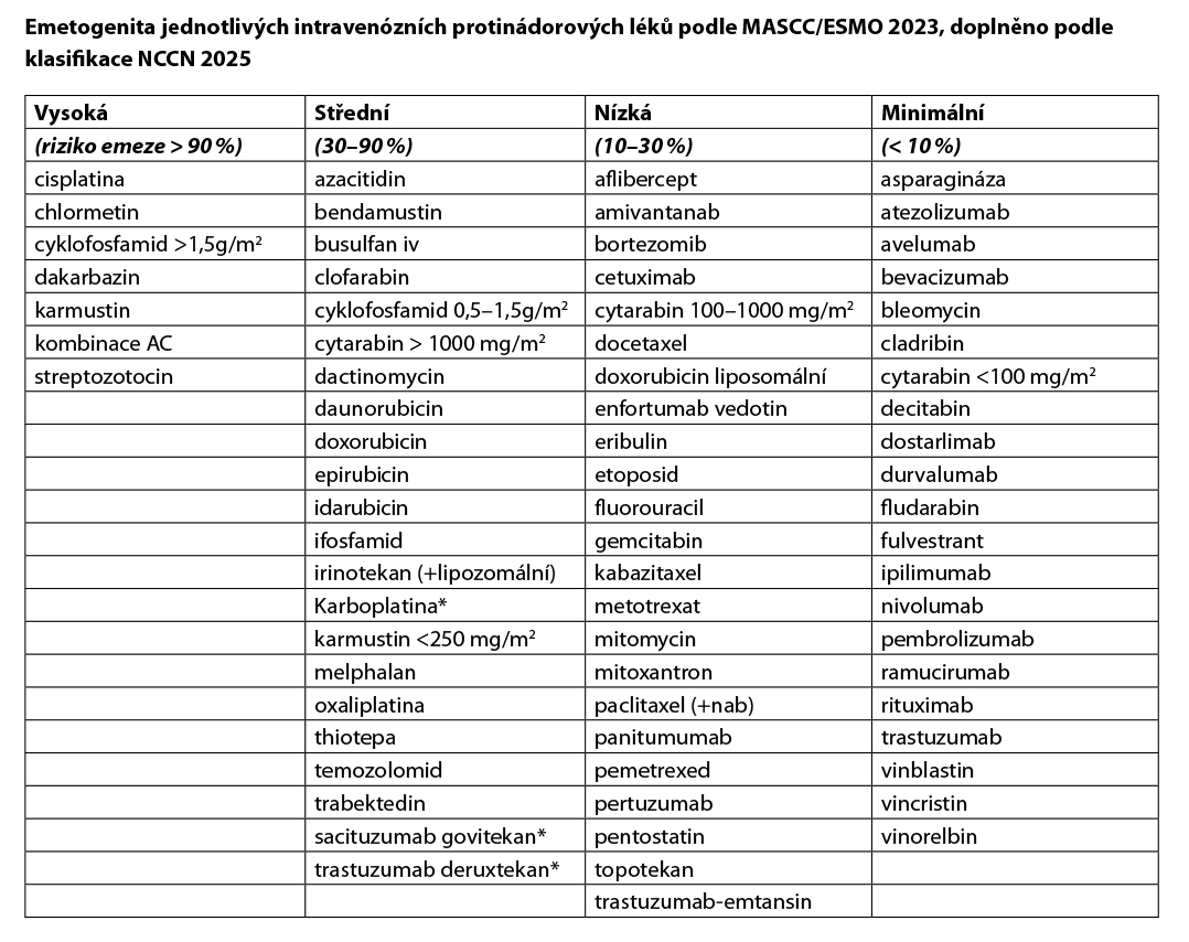 Klasifikace cytotoxických léků podle stupně emetogenity se poněkud liší podle různých zdrojů, prodělává určitý vývoj v čase a nemusí proto být definitivní. V našich podmínkách preferujeme společná guidelines mezinárodní a evropská, vypracovaná odbornými společnostmi MASCC a ESMO s poslední aktualizací v roce 2023, případně každoročně aktualizovaným guidelines NCCN.