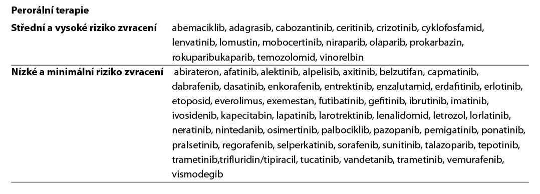 Emetogenita jednotlivých perorálních protinádorových léků podle MASCC/ESMO 2023, doplněno podle klasifikace NCCN 2025