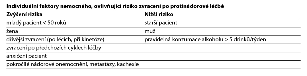 • emetogenita chemoterapie závisí také na individuálních faktorech nemocného, které jsou již zahrnovány do úvahy při rozhodování o antiemetické kombinaci léků.