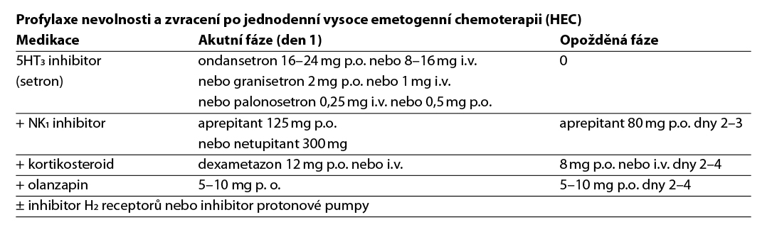 • čtyřkombinace setron + NK1 inhibitor + dexametazon + olanzapin je doporučený typ profylaxe od prvního cyklu HEC (i když aprepitant je hrazen až po selhání předchozí léčby)