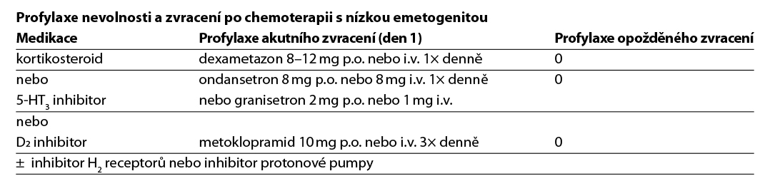 Při chemoterapii s minimální emetogenitou není u nemocných s negativní anamnézou doporučena rutinní profylaxe akutního ani opožděného zvracení.