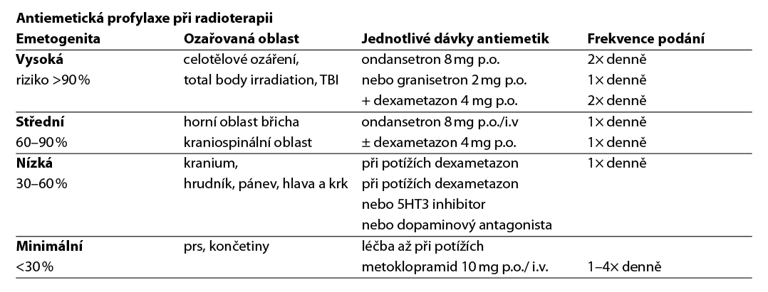 • při kombinaci radioterapie s chemoterapií je profylaxe podávána podle více emetogenní složky, většinou podle chemoterapie.