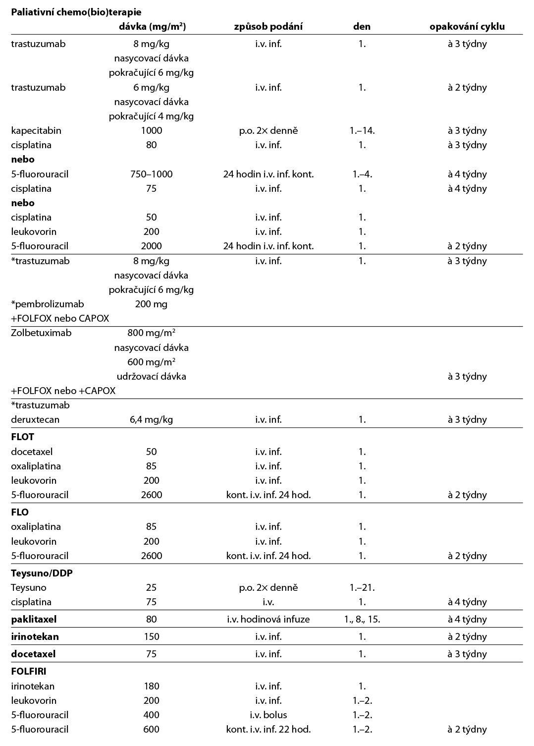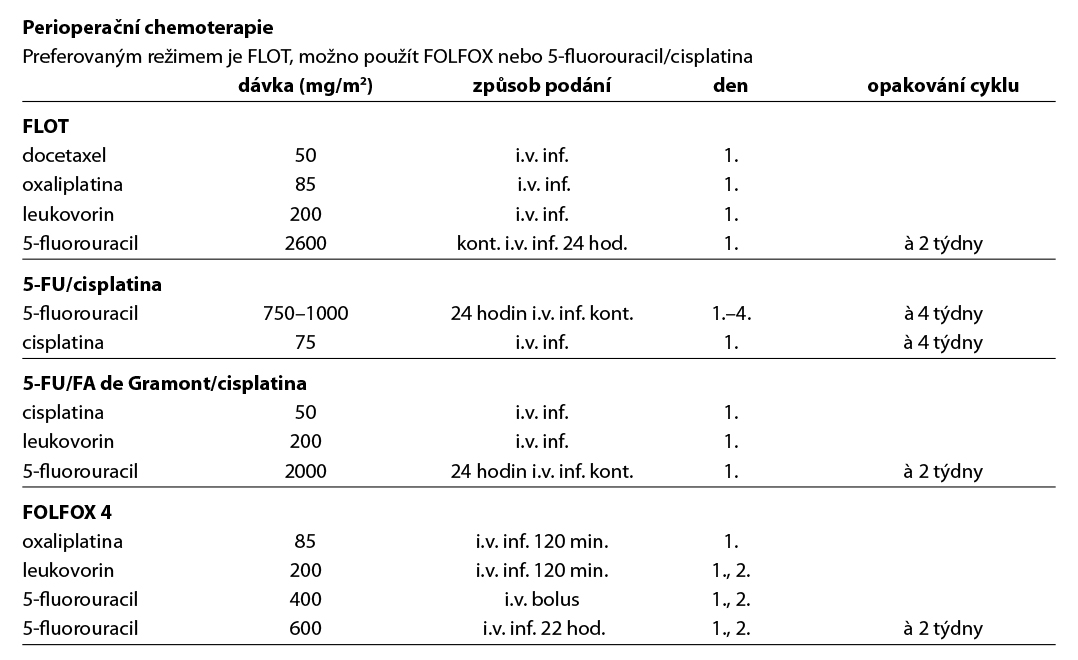- režim FLOT zlepšil ve studii AIO celkové přežití pacientů s lokálně pokročilým onemocněním a je preferovaným standardem perioperační léčby (OS 50 vs 35 měsíců, HR 0,77, 95 % CI: 0,630,94, p = 0,12); pro starší pacienty s komorbiditami je alternativou dvojkombinace 5-fluorouracilu s oxaliplatinou,